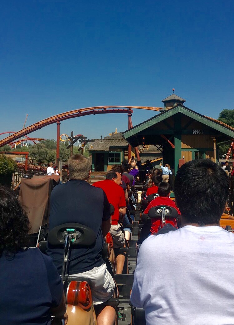 We arrived at the park around 11 am, about an hour after opening. The crowds weren’t terrible, but they were more than we expected for a Thursday. As soon as we entered the gates, we ran right to the entrance of Ghost Rider, the GCI Wooden Coaster.