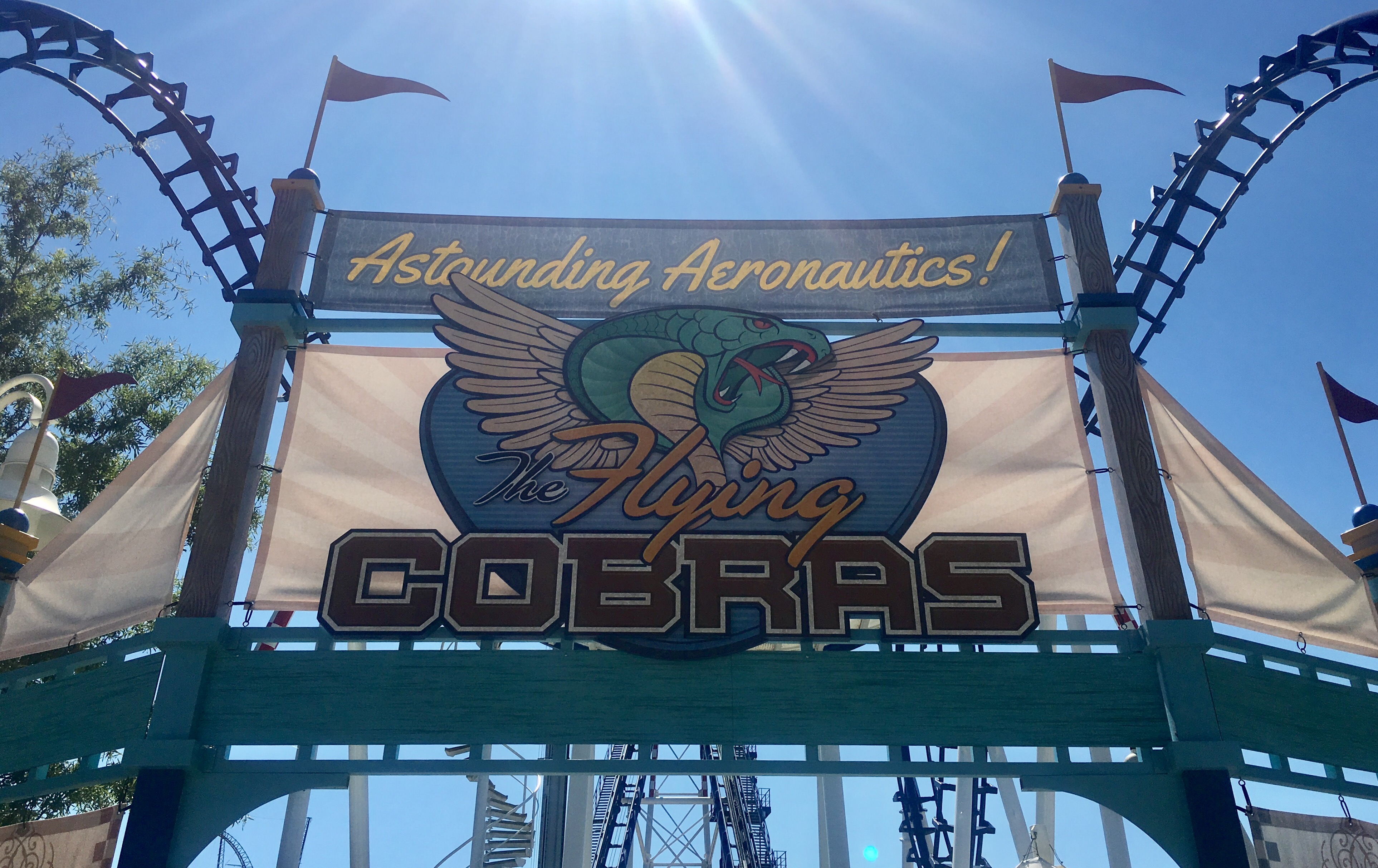 Only a little more than an hour had gone by, and we had already had 5 total rides 4 coasters. Our original plan was to ride the parks flying coaster, Nighthawk, before lines got too long, but it was looking like the park wasn’t crowded enough for it to receive a large line. Instead, we walked into the New for 2017 County Fair area, home to Flying Cobras.