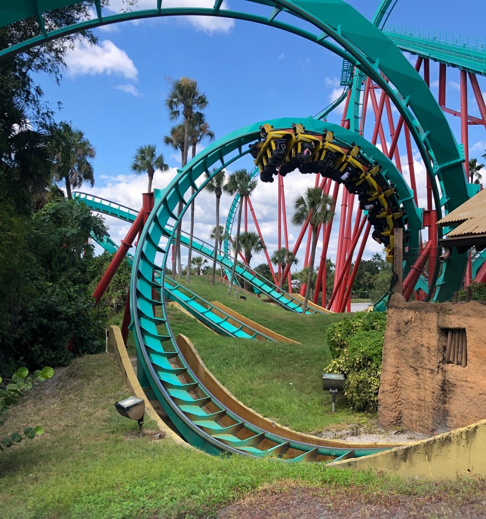 Kumba is a fast paced and intense B&M (Bolliger & Mabillard) sit down steel roller that opened in 1993 at Busch Gardens Tampa. Kumba is one of five B&M sit down coasters in the world, making it a special and rare experience. Kumba opened as Busch Gardens Tampa’s second roller coaster, with seven unique inversions. I’ve ridden this coaster more times than I can count, and here are my thoughts: