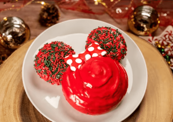 The Main Street Bakery is always whipping up some sweet treats. During the party, they’ll feature the classic Minnie-shaped Cinnamon Roll. As you can see, this isn’t you’re average cinnamon roll; it’s topped with red icing, red and green sprinkles, and a polka-dot bow made of chocolate.