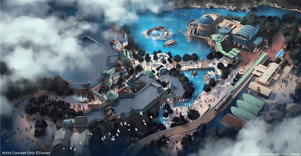 Still, the concept art doesn’t just feature new additions. There’s also a pretty big attraction missing, that being Aquatopia. As previously stated, it was an opening-day attraction, and it’s said to be removed to make way for a new, unspecified attraction. Other existing attractions in the area like the Tokyo DisneySea Electric Railway, Tokyo DisneySea Transit Steamer and the Nemo & Friends SeaRider are all still visible in the concept art, meaning they’ll most likely be retained during the expansion. That said, the artwork looks to show a circular turnaround for the Transit Steamer, which potentially means that they might seal off the waterway that connects it to the American Waterfront area of the park.